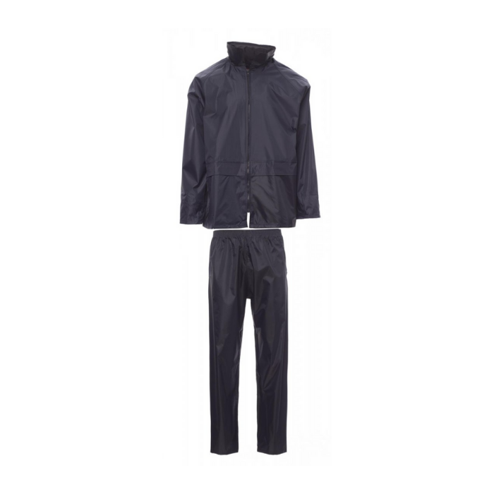 Descrizione: Completo antipioggia, composto da giacca con zip, cappuccio richiudibile nel colletto, fondo manica dritto, retinatura sulla schiena. Pantalone con elastico in vita e due tasche. Imbusto singolo con zip.