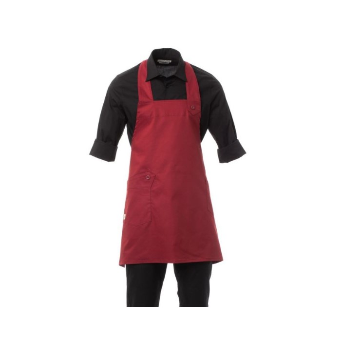 Descrizione: Grembiule unisex, multifunzione, con pettorina regolabile con 2 bottoni sul retro collo, realizzato in twill di cotone e Lycra® T400®, con ottime proprietà elastiche e traspiranti. Presenta un taschino porta oggetti e una tasca più ampia, impreziosita da bottone. Misure: 80x70cm
