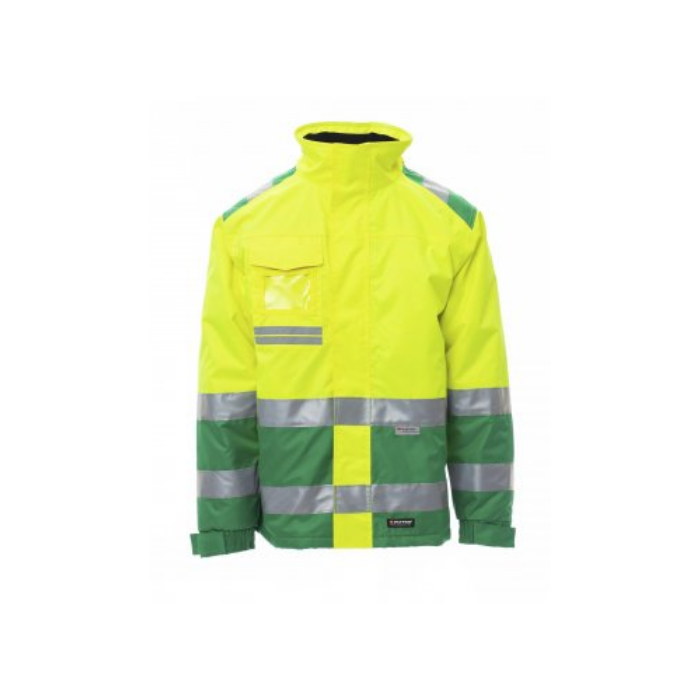 Descrizione: Giacca da uomo bicolore in alta visibilità con bande 3M, zip in plastica con cursore in metallo coperta con patta e velcro, con cappuccio a scomparsa, polsini elasticizzato regolabile, due tasche frontali coperte, una tasca al petto con porta badge, interno: imbottito, colletto e spalle in pile, una tasca interna, cuciture termonastrate.