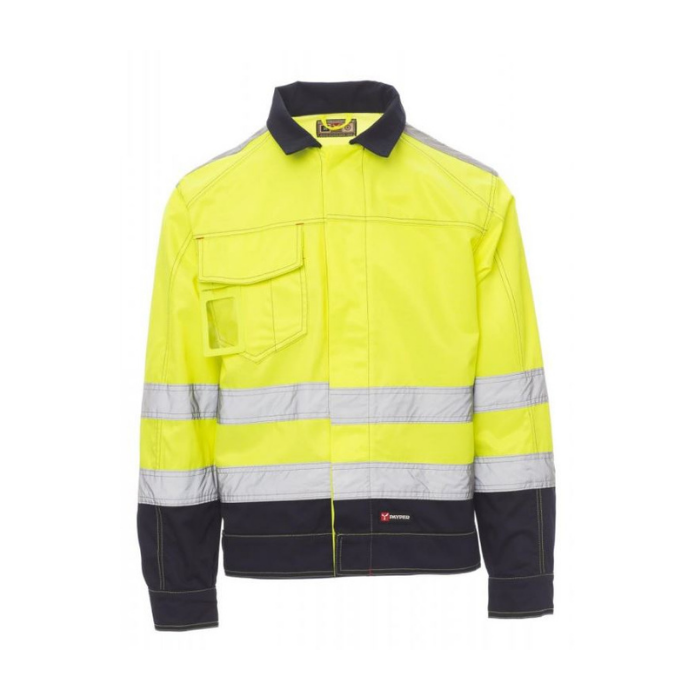 Descrizione: Giubbino unisex multistagione, chiusura frontale con bottoni in plastica e patta di copertura, chiusura polsi con bottone, vita regolabile con velcro; impunture a contrasto, porta smartphone, porta badge staccabile e porta penna nella tasca al petto con patta e velcro. taglio slanciato modello jeans.