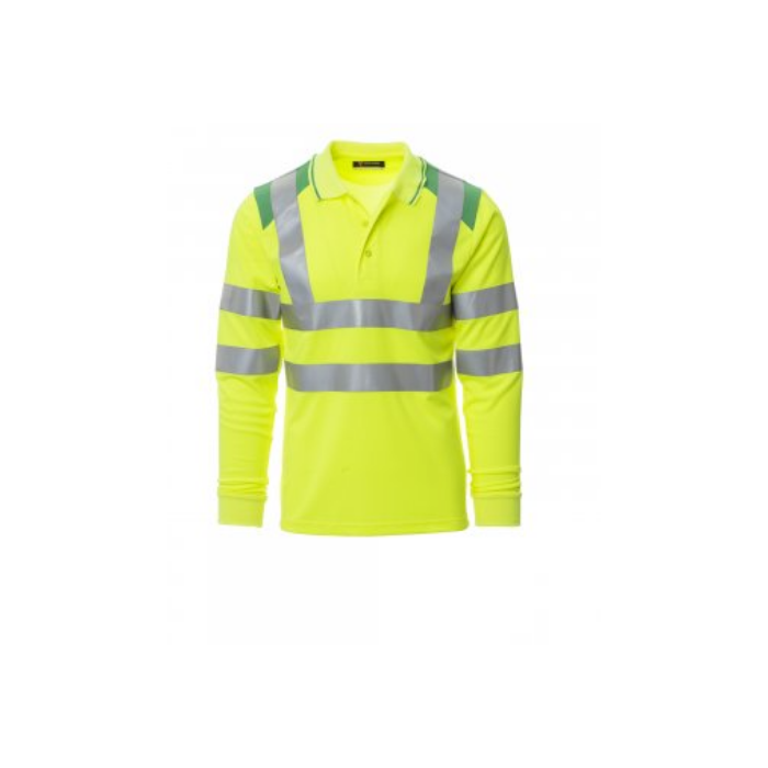 Descrizione: Polo bicolore a manica lunga in alta visibilità con bande riflettenti, con 3 bottoni in tinta effetto perlato, collo e bordo manica con fine profilo a contrasto, colletto e bordo manica a costine, spacchetti laterali, cuciture del collo coperte.