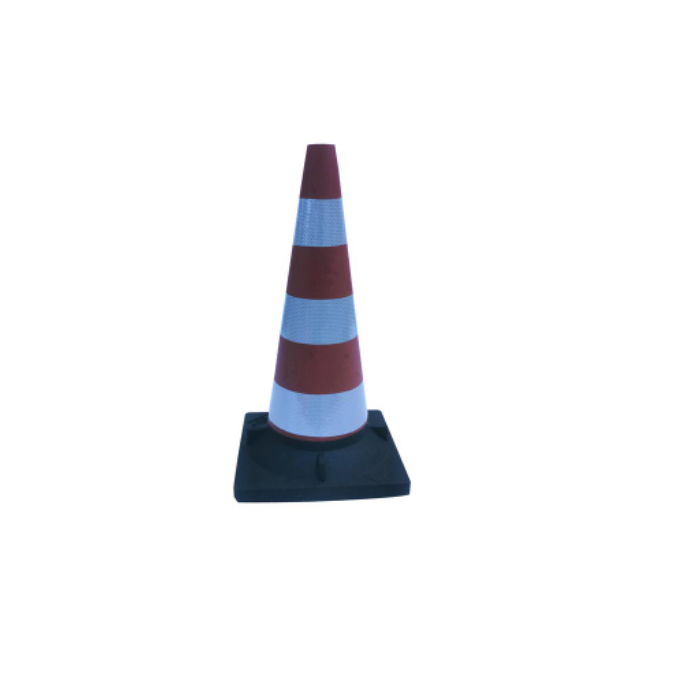 Descrizione: Cono realizzato in gomma per garantire un’elevata elasticità. La parte conica è verniciata di colore rosso con vernici antinvecchiamento e, per rendere il cono visibile sia di giorno che di notte, viene applicata una pellicola rifrangente di classe II. La base, di colore nero, è dotata sia nella parte inferiore che superiore di piedini che facilitano l’impilazione dei coni e permettono il deflusso delle acque.