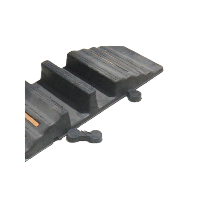 Descrizione: Passacavi realizzati con mescola di gomma super elastica, recano due alloggiamenti per il passaggio di tubazioni o cavi. Utilizzabili nei cantieri temporanei o per lavori di manutenzione. Accoppiabili tramite elementi di giunzione ad incastro. Testati per una portata massima di 70 q.li per singolo assale. Dotati di quattro inserti gialli rifrangenti. Non Tassellabile.