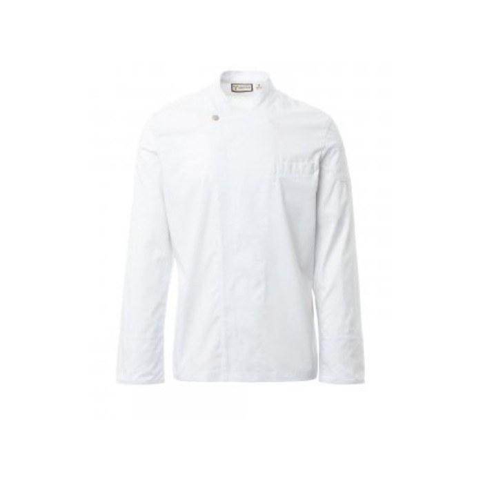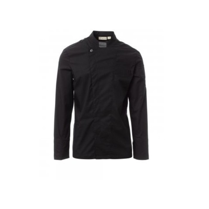 Descrizione: Giacca da cuoco con collo alla coreana, realizzata in ripstop di cotone e Lycra® T400®, con ottime proprietà elastiche e traspiranti, e con confortevole tessuto a rete su schiena, sottomanica e sotto giromanica, per amplificare la traspirazione. Chiusura a doppio petto con bottoni automatici. Manica lunga con polsino risvoltabile. Iconica toppa sagomata sulla spalla sinistra, con ricamo ad elica tono su tono, provvista di taschino porta penne. Taschino al petto e pratica tasca porta smartphone in vita.
