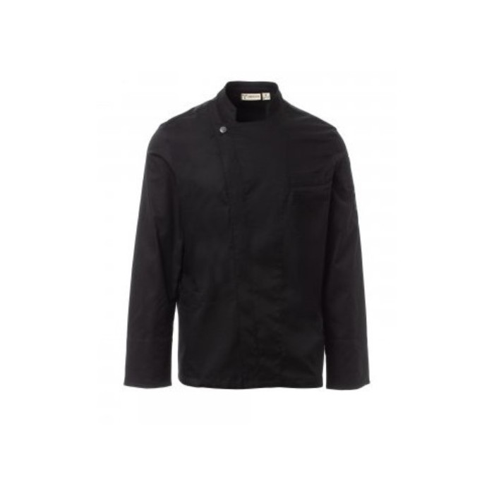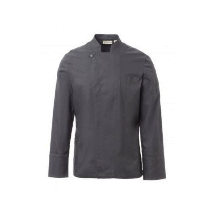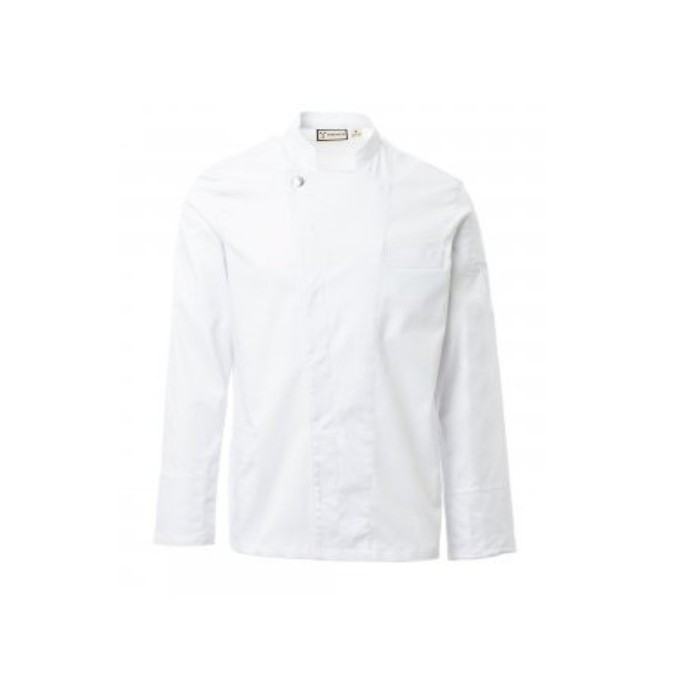 Descrizione: Giacca da cuoco con collo alla coreana, realizzata in twill di cotone e Lycra® T400®, con ottime proprietà elastiche e traspiranti. Chiusura a doppio petto con bottoni automatici. Manica lunga con polsino risvoltabile, lunetta con confortevole tessuto a rete nel sotto giromanica, per agevolare la traspirazione. Iconica toppa sagomata sulla spalla sinistra, con ricamo ad elica tono su tono, provvista di taschino porta penne. Taschino al petto e pratica tasca porta smartphone in vita. Spacchi verticali nel fondoschiena per facilitare i movimenti.