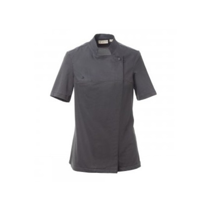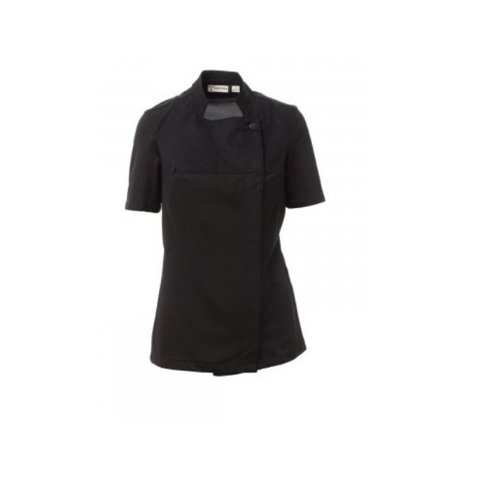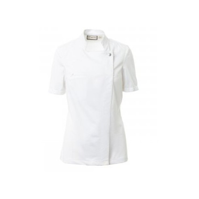 Descrizione: Giacca da cuoca con collo alla coreana, realizzata in twill di cotone e Lycra® T400®, con ottime proprietà elastiche e traspiranti, e con confortevole tessuto a rete su schiena, maniche e vita, per amplificare al massimo la traspirazione. Chiusura a doppio petto con bottoni automatici, lembo ripiegabile e fissabile al petto mediante allaccio ad un bottone a vista, che crea l’effetto di un bavero sartoriale e di un innovativo scollo a V. Manica corta con orlo. Tasca al petto nascosta.
