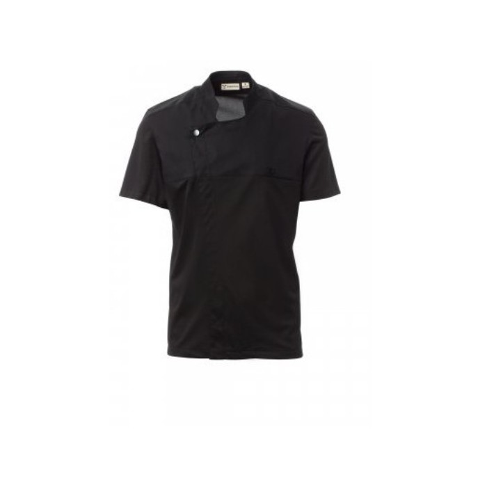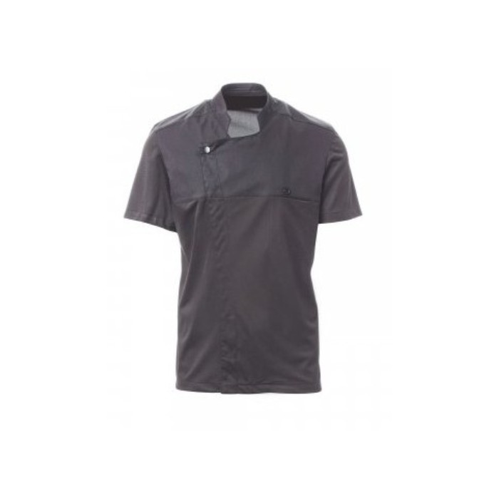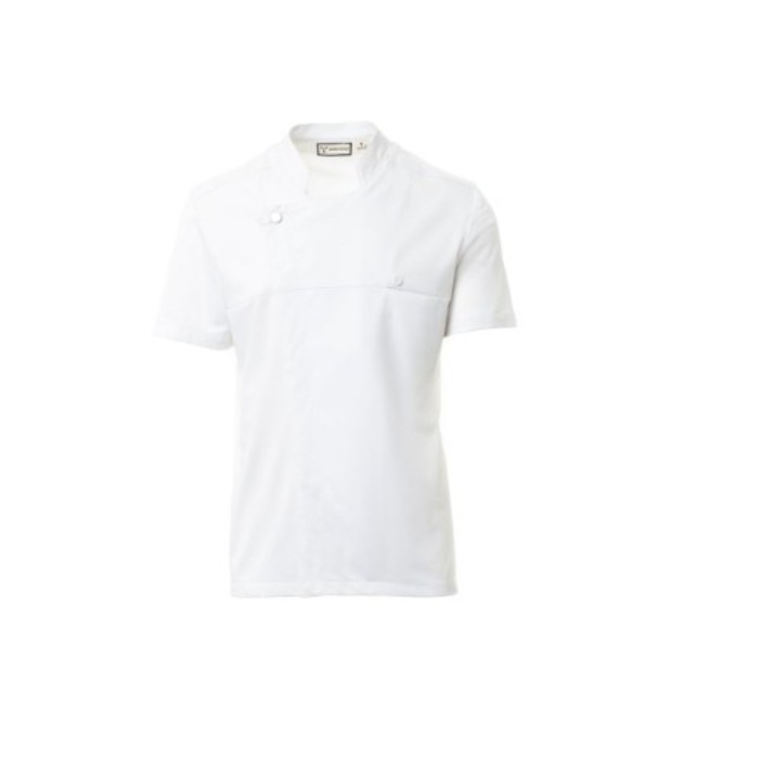 Descrizione: Giacca da cuoco con collo alla coreana, realizzata in twill di cotone e Lycra® T400®, con ottime proprietà elastiche e traspiranti, e con confortevole tessuto a rete su schiena, maniche e vita, per amplificare al massimo la traspirazione. Chiusura a doppio petto con bottoni automatici, lembo ripiegabile e fissabile al petto mediante allaccio ad un bottone a vista, che crea l’effetto di un bavero sartoriale e di un innovativo scollo a V. Manica corta con orlo. Tasca al petto nascosta.