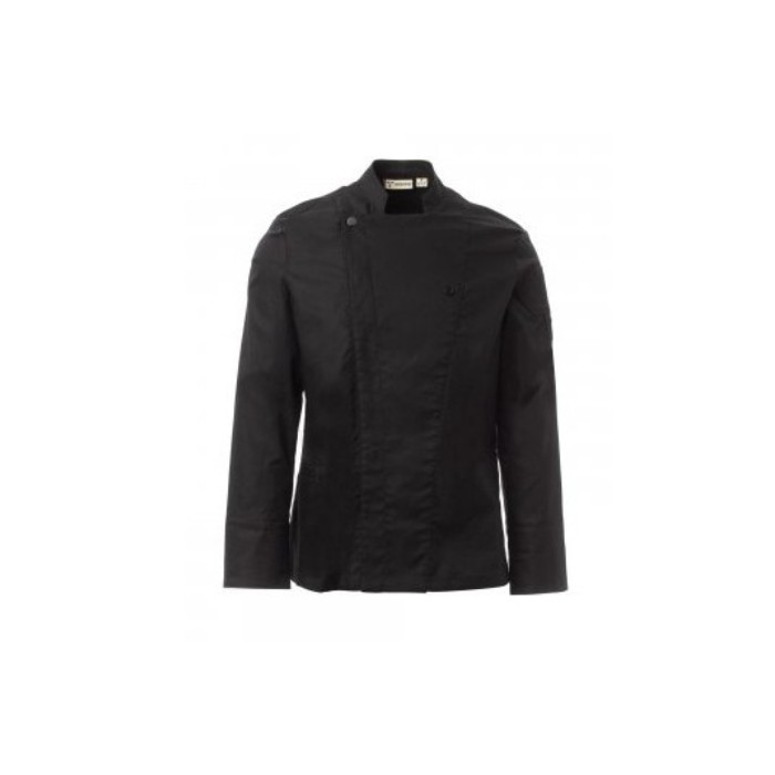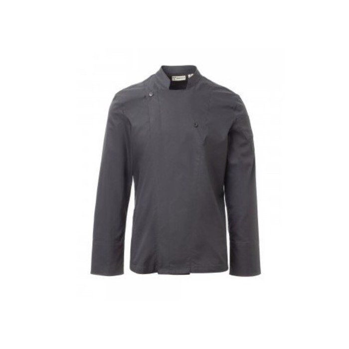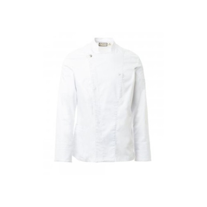 Descrizione: Giacca da cuoco con collo alla coreana, realizzata in twill di cotone e Lycra® T400®, con ottime proprietà elastiche e traspiranti. Chiusura a doppio petto con bottoni automatici, lembo ripiegabile e fissabile al petto mediante allaccio ad un bottone a vista, che crea l’effetto di un bavero sartoriale e di un innovativo scollo a V. Manica lunga con polsino risvoltabile, lunetta in tessuto a rete nel sotto giromanica, per agevolare la traspirazione. Iconica toppa sagomata sulla spalla sinistra, con ricamo ad elica tono su tono, provvista di taschino porta penne. Pratica tasca porta smartphone in vita. Spacchi verticali nel fondoschiena per facilitare i movimenti.