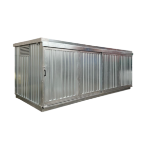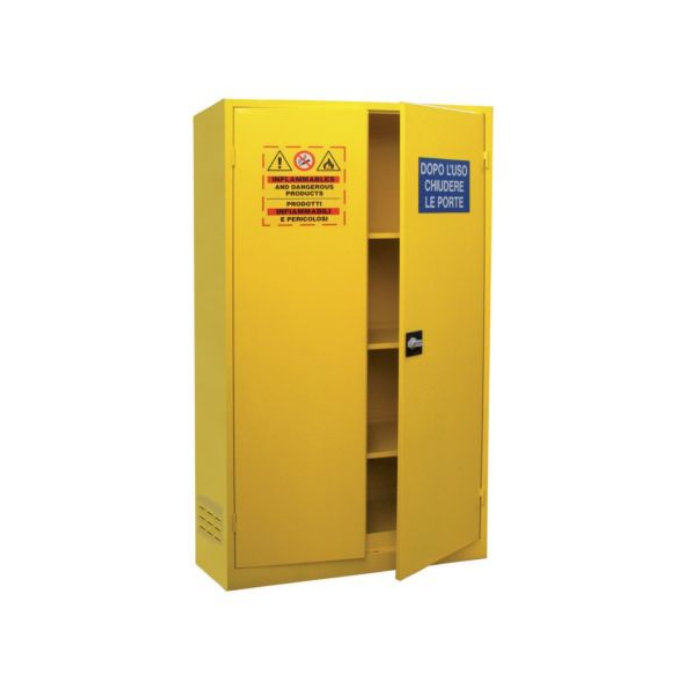 Descrizione: Armadio per lo stoccaggio di liquidi pericolosi costruiti con materie prime certificate secondo le normative vihenti sulla protezione ambientale e prevenzione di inquinamento. Realizzati in lamiera di acciaio al carbonio P02, spessore 10/10, pre-trattato con fosfosgrassaggio in tunnel alte temperature, verniciatura in epossipoliestere RAL 1021 e cotturas in galleria termica 180gradi. Dotati di ripiani di contenimento regolabili in altezza e vasca di raccolta a tenutra stagna sul fondo con guarnizioni in gomma, due griglie di areazioned laterali e una posizionata sul tetto con sistema tagliafiamma appositamente studiate per il circolo dell’aria e per l’aspirazione forzata.