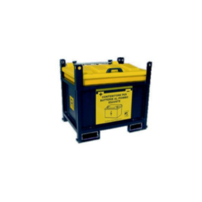 Descrizione: Contenitori per la raccolta di rifiuti pericolosi e accumulatori esausti composti da: una vasca dotata di coperchio incernierato asportabile, il corpo vasca è alloggiato all’interno di una struttura metallica che permette la movimentazione e l’impilabilità fino a tre unità. I contenitori per la raccolta di accumulatori esausti sono conformi alle disposizioni dell’Art.235 D.lgs.152/2006 e D.lgs.188/2008