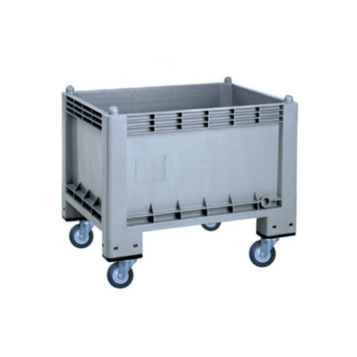 Descrizione: Contenitore industriale stampato a iniezione con resine poliolefiniche (polipropilene) resistente agli acidi e ai solventi in genere. Dotato di coperchio, sovrapponibile, con ruote. Ottima rigidità e resistenza alle deformazioni, per lo svuotamento dei liquidi sono previste due bocchette laterali di scarico apribili all’occorrenza nelle quali possono essere montati tappi a vite o valvole a sfera in resina.