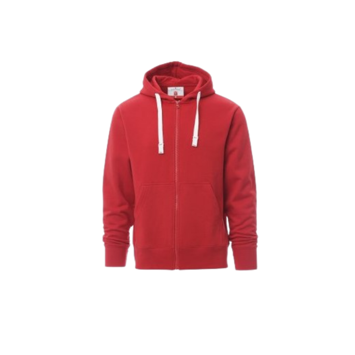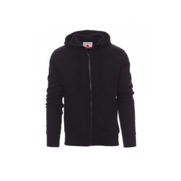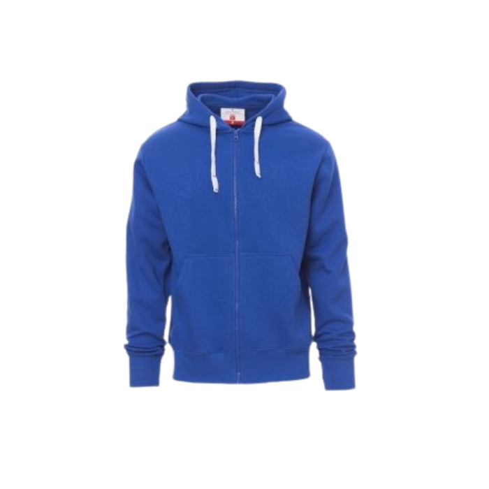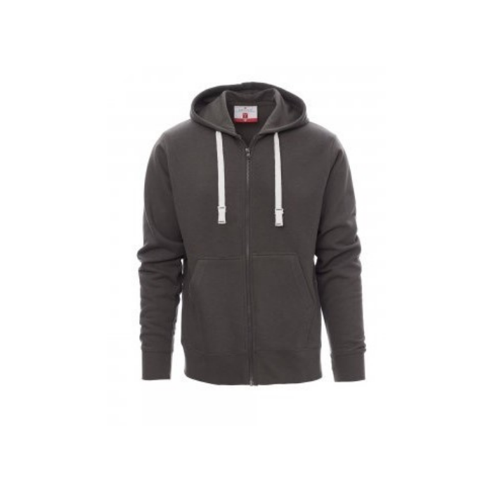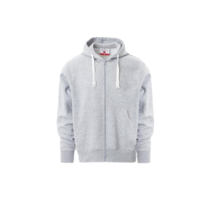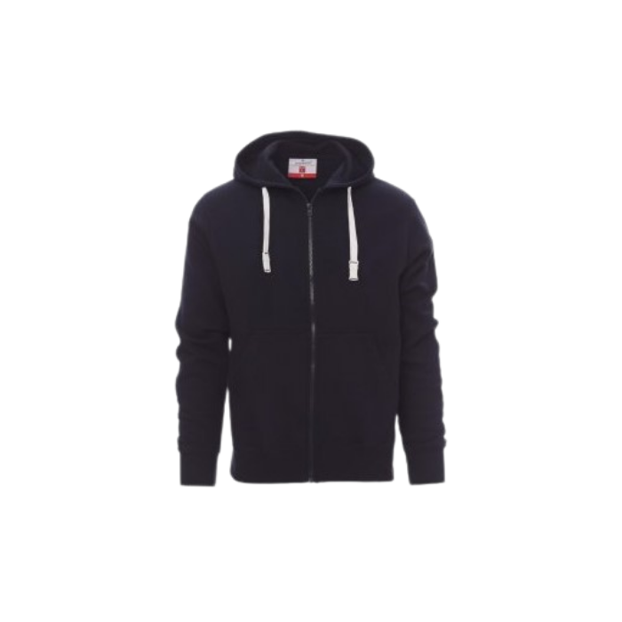 Descrizione: Felpa da uomo con: zip intera in plastica a cursore singolo in metallo, cappuccio, coulisse in corda con cuciture in tinta con la felpa, manica a giro, tasche a marsupio e polsini e vita in costina elasticizzata. Cuciture rinforzate, nastro di rinforzo interno collo in tinta.