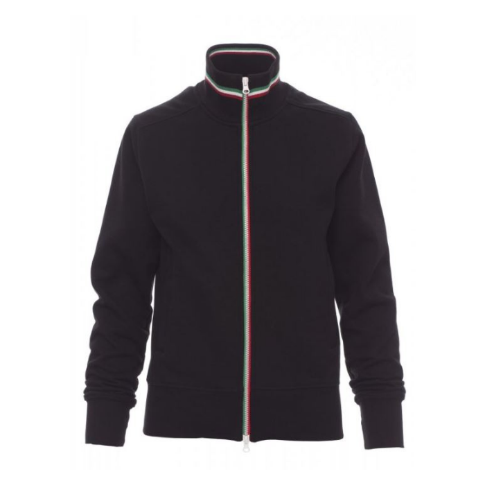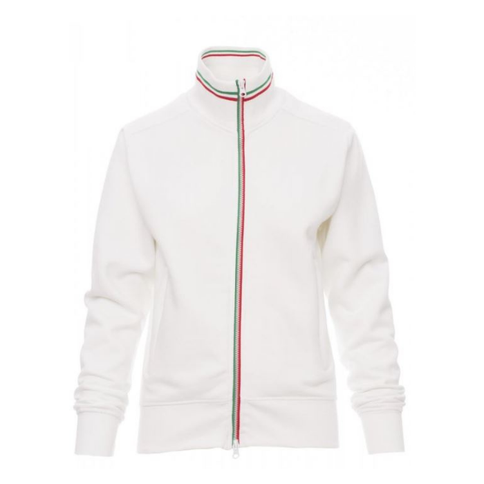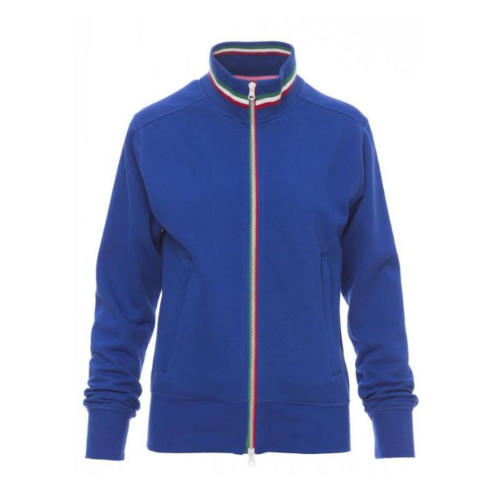 Descrizione: Felpa sfiancata da donna, zip intera SBS in plastica con tricolore a contrasto con doppio cursore in metallo, colletto in rib contricolore a contrasto, manica a giro, due tasche esterne, polsini e vita in costina elasticizzata, cuciture rinforzate.