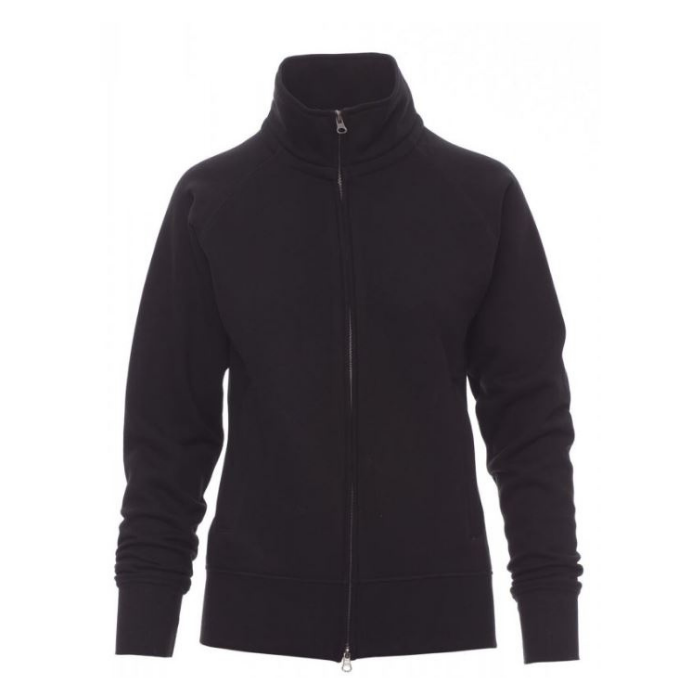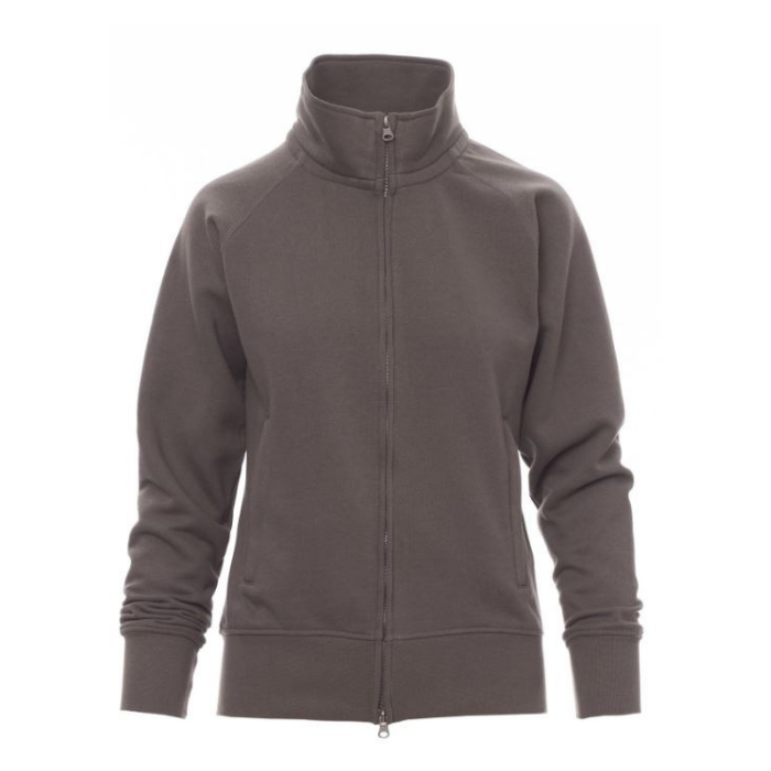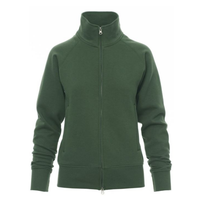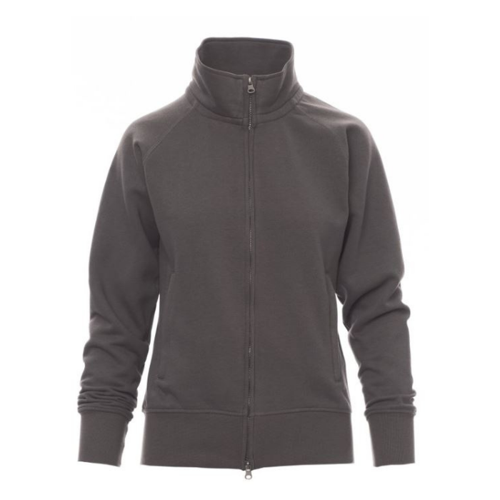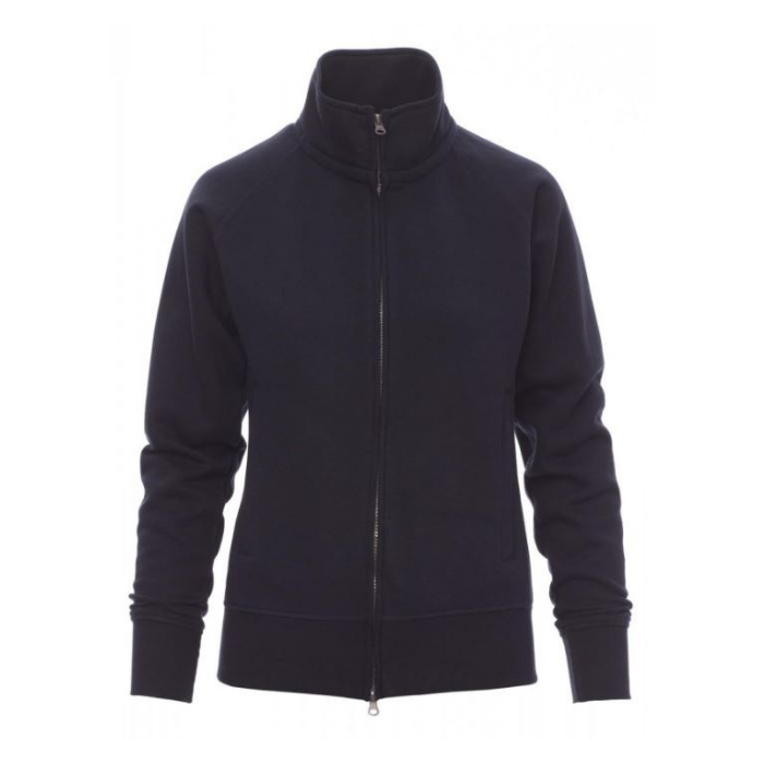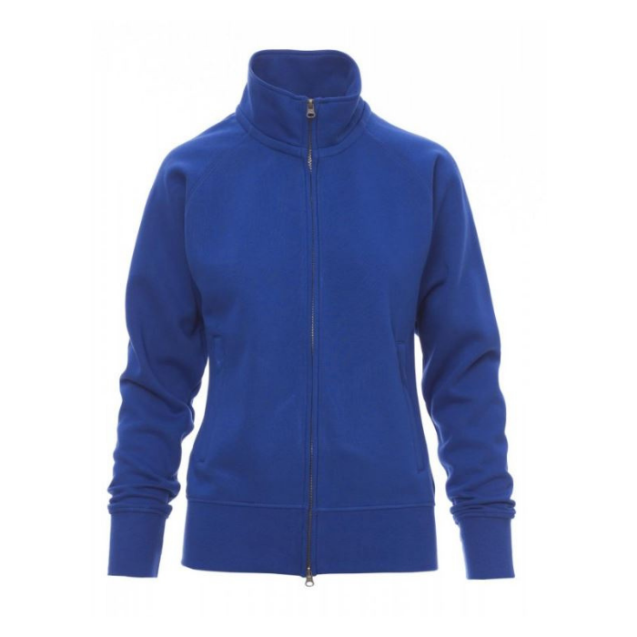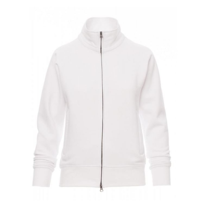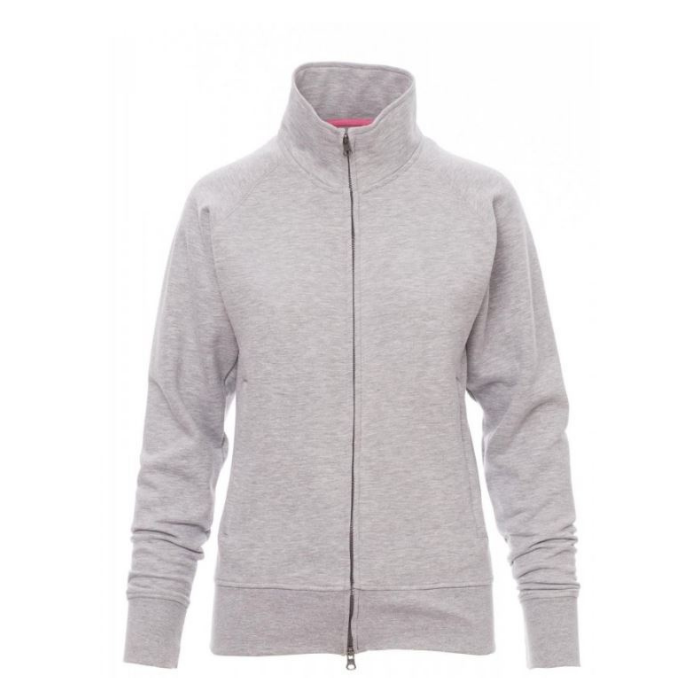 Descrizione: Felpa da donna, zip intera SBS coperta, in plastica con doppio cursore in metallo, manica raglan, due tasche con zip coperte, polsini e vita in costina elasticizzata, cuciture rinforzate.