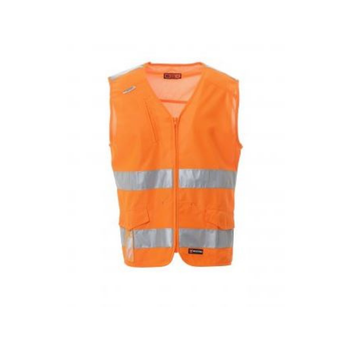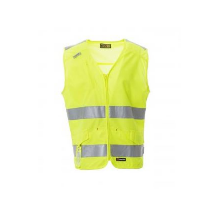 Descrizione: Gilet in alta visibilità con bande 3M, chiusura frontale con zip, due tasche frontali modello canguro con patta di chiusura lock system e velcro, una tasche al petto con zip.
