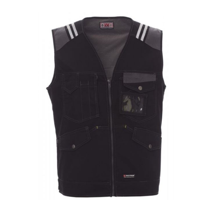 Descrizione: Gilet con inserti e impunture bicolore a contrasto, a taglio slanciato modello jeans, chiusura frontale con zip, due tasche frontali modello canguro con patta di chiusura LOCK SYSTEM e bottone in metallo, due tasche al petto di cui una LOCK SYSTEM, porta badge staccabile e richiudibile, portacellulare; piping riflettente sulla schiena; bande riflettenti alle spalle per maggior sicurezza e visibilità; fodera interna in dry-tech.