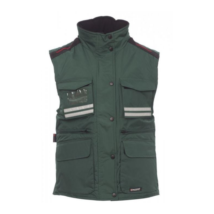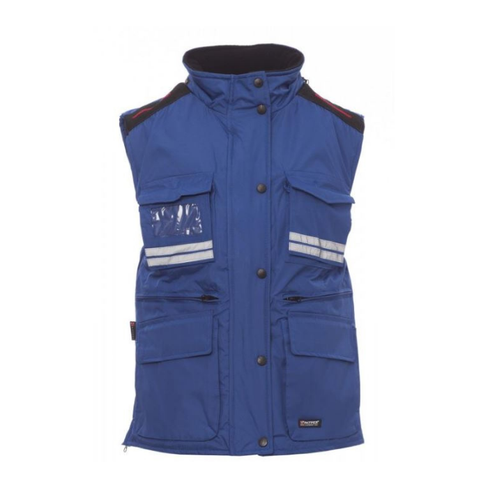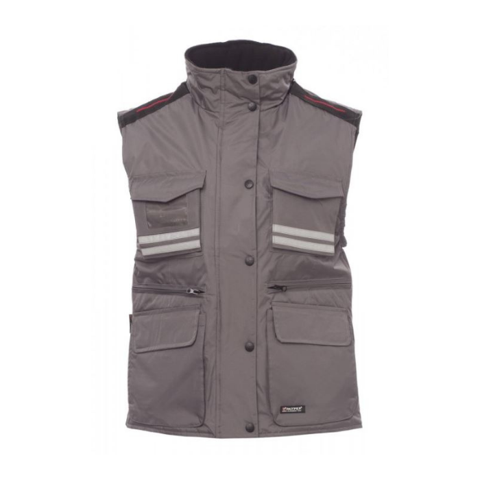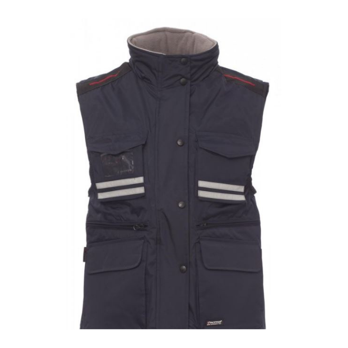 Descrizione: Gilet ergonomico da donna, zip 8mm in plastica con cursore in metallo con patta e bottoni in plastica, cappuccio sagomato staccabile e/o richiudibile nel colletto, bande riflettenti grigie fronte e retro, spacchetto laterale con soffietto e zip, nove tasche esterne di cui due Lock System, due con zip e interno rinforzato, una con porta badge reversibile. Interno: imbottito, colletto, schiena e scalda reni in micropile, coulisse in vita e zip interna per agevolare stampe e ricami.
