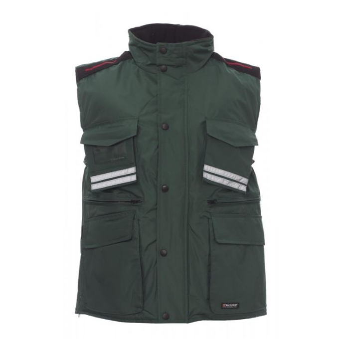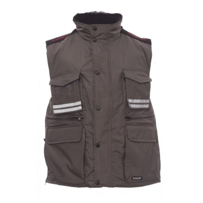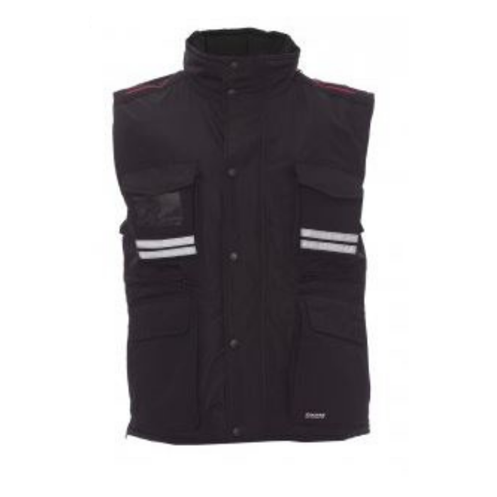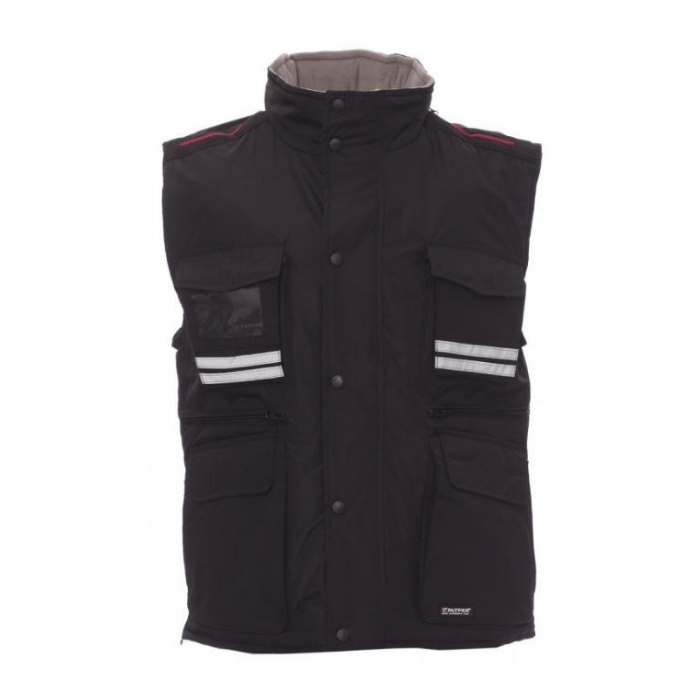 Descrizione: Gilet da uomo, zip 8mm in plastica con cursore in metallo con patta e bottoni in plastica, cappuccio sagomato staccabile e/o richiudibile nel colletto, bande riflettenti grigie fronte e retro, spacchetto laterale con soffietto e zip, nove tasche esterne di cui due Lock System, due con zip e interno rinforzato, una con porta badge reversibile. Interno: imbottito, colletto, schiena e scalda reni in micropile, coulisse in vita e zip interna per agevolare stampe e ricami.