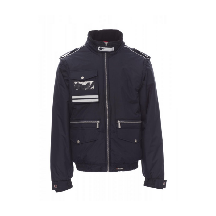 Descrizione: Giubbino da uomo, maniche staccabili, dal design casual dall’effetto slanciato, zip in plastica con cursore in metallo, cappuccio richiudibile nel colletto, vita elasticizzata, polsini regolabili, spalline e chiusura al collo, due tasche LOCK SYSTEM, due tasche con cerniera, una tasca portabadge reversibile, piping reflex alle spalle e doppia fascia riflettente sulla tasca al petto e sulla schiena. Interno: imbottito, rifinito con fodera in alta densità argentata, schiena in micropile, colletto in pile, una tasca.