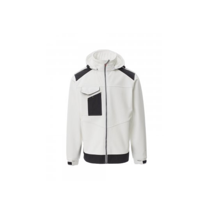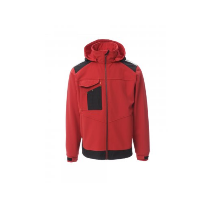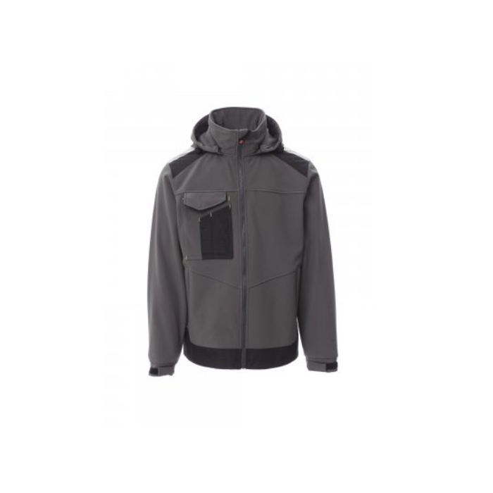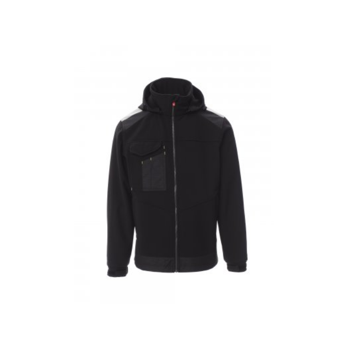 Descrizione: Giacca ergonomica da uomo con: manica giro, zip intera SBS in plastica con cursore in metallo autolock, due tasche laterali con cerniera, una tasca multifunzionale al petto con porta badge a scomparsa e patta di chiusura Lock System, bande riflettenti 3M alle spalle, elastico e stringipolso in velcro, cappuccio amovibile e con coulisse in elastico regolabile con stopper.