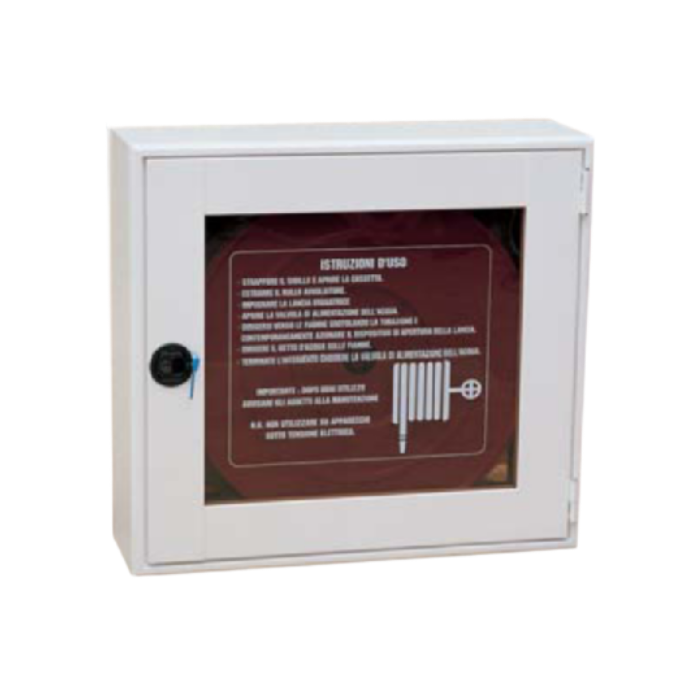 Descrizione : Naspo con cassetta in acciaio bianca sp. 1mm verniciato con polvere poliestere sp. 70 micron colore bianco RAL 9010, lastra infrangibile.
