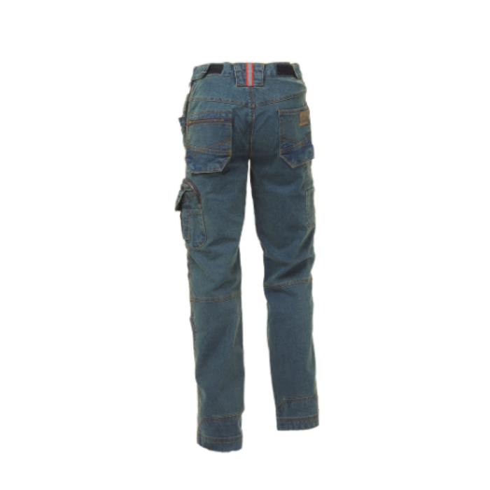 Descrizione: Pantalone in tessuto jeans stretch con: 2 ampie tasche anteriori con soffietti tecnici stretch, tasca portamonete, tasca laterale portautensili, multitasca funzionale laterale con portacellulare e 2 tasche posteriori con sistema Free Pocket di cui una con chiusura di sicurezza con zip. Inserti tecnici stretch laterali e su snodo ginocchio, regolazione vita con velcri e triple cuciture.