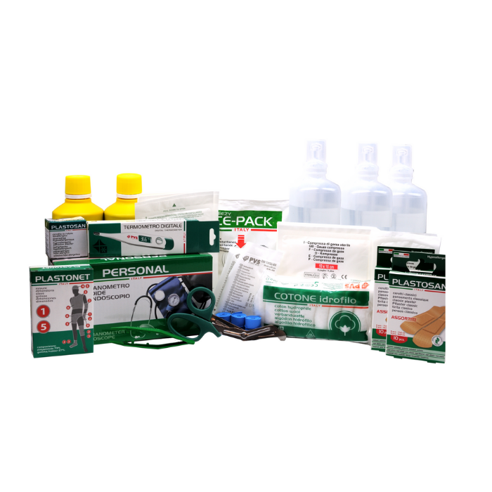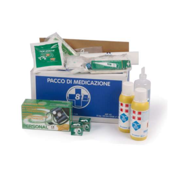 Descrizione: Pacco medicazione, da 3 lavoratori, per cassette pronto soccorso e armadietti con contenuto base a norma del DM 388 15/07/03 allegato 1 e D.L. 81 del 09/04/08 art.45.