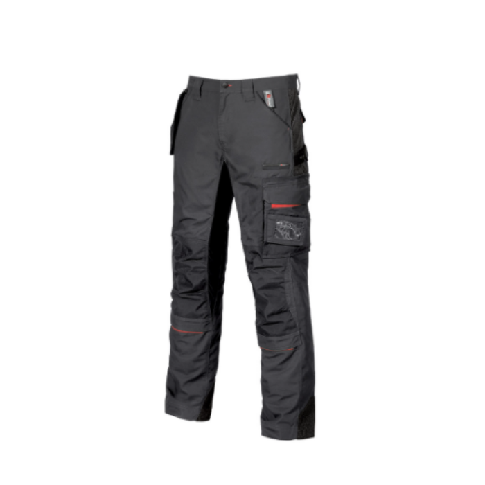 Descrizione: Pantalone dotato di: tasca removibile fly pocket, 2 ampie tasche anteriori, tasca invisibile, tasca laterale portautensili, tasca laterale multifunzionale, 2 Free Pocket posteriori in Cordura con chiusura di sicurezza a velcro. Presenta inoltre 2 tasche porta ginocchiera in Cordura con interno elasticizzato, porta martello regolabile, regolazione in vita con elastico per massimo comfort e fettuccia portachiavi brandizzata. Inserti stretch ad alta vestibilità ed ergonomici, inserti in tessuto Cordura e antiabrasivo nelle zone di massimo contatto, inserti reflex. Supporti di rinforzo per velcri, triple cuciture. Bottone antigraffio, zip YKK.