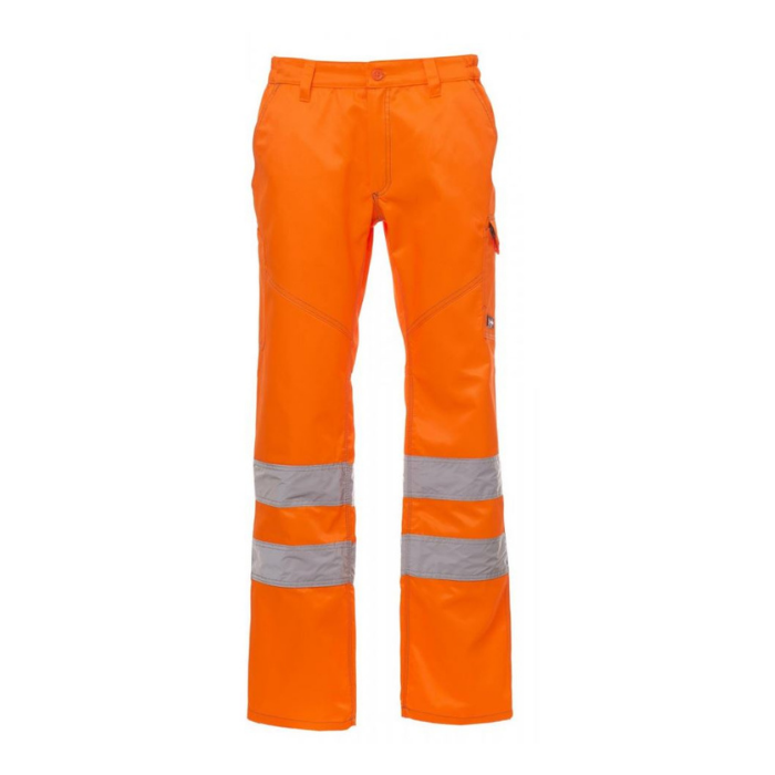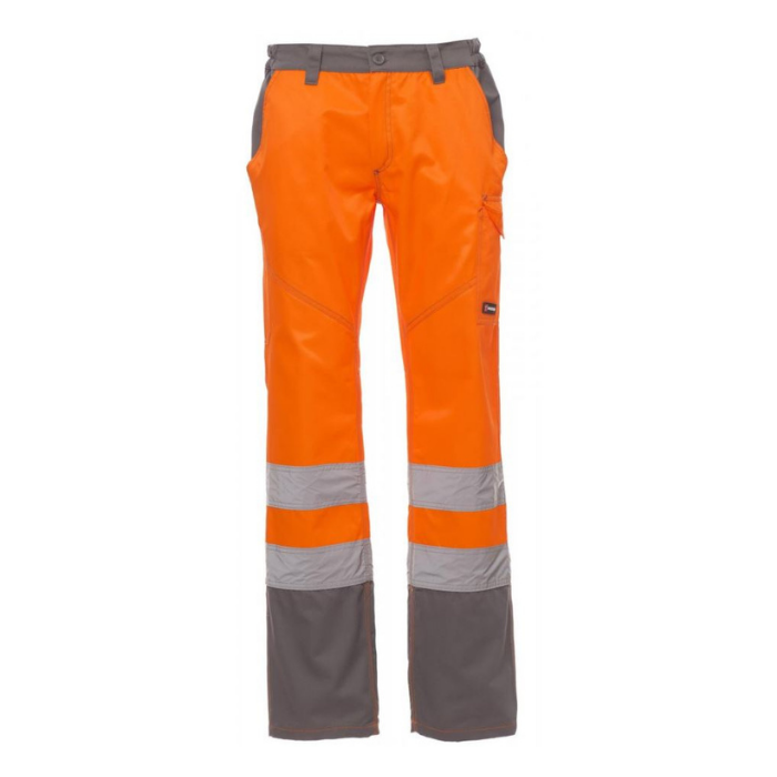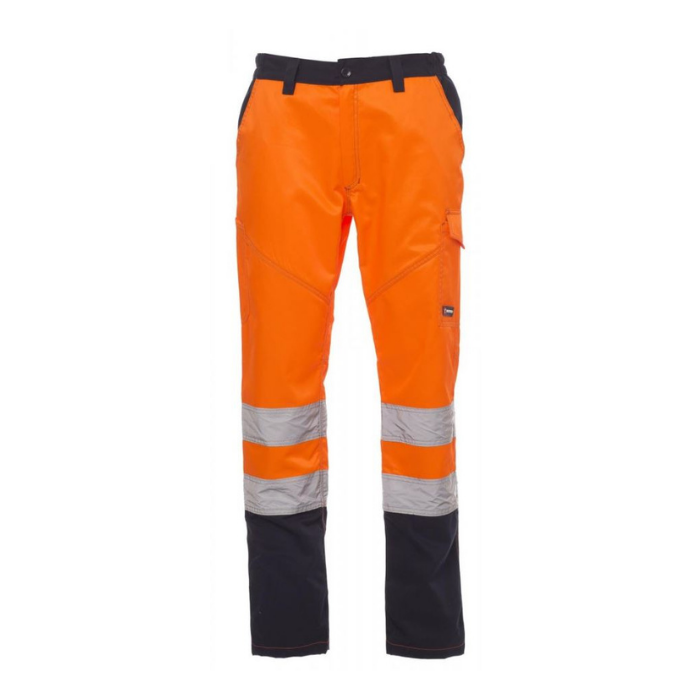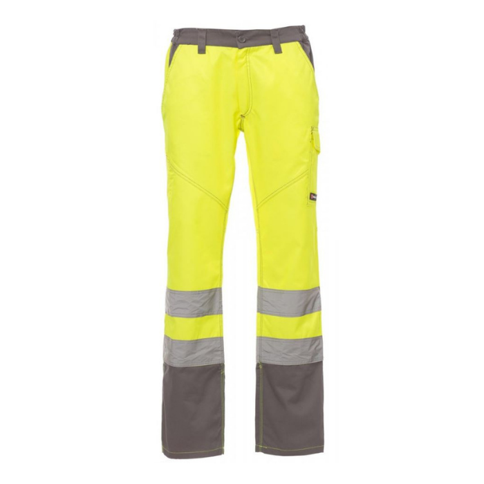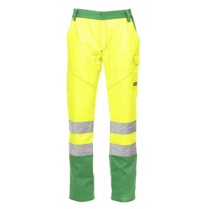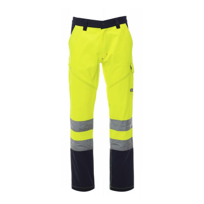 Descrizione: Pantalone da uomo multi stagionale con: in alta visibilità con bande riflettenti, elastici laterali e passanti in vita, chiusura con zip e bottone in plastica, due tasche anteriori a taglio classico, tasca laterale Lock System, porta metro, due tasche posteriori una aperta e una con patta e velcro. Cuciture a contrasto, cavallo e interno gamba a triplo ago.