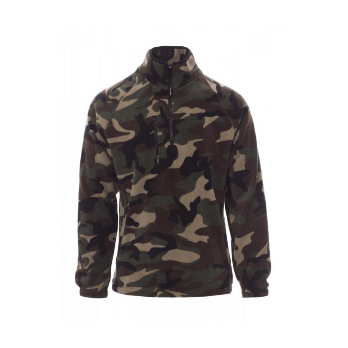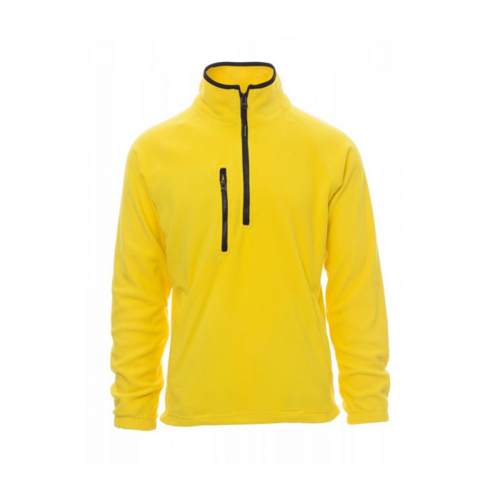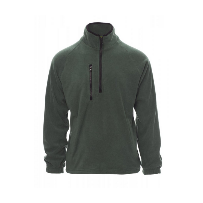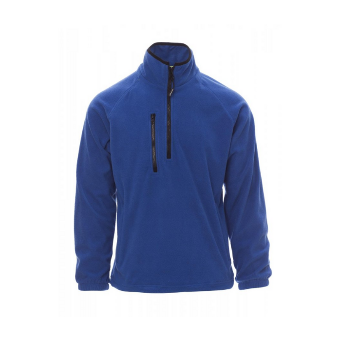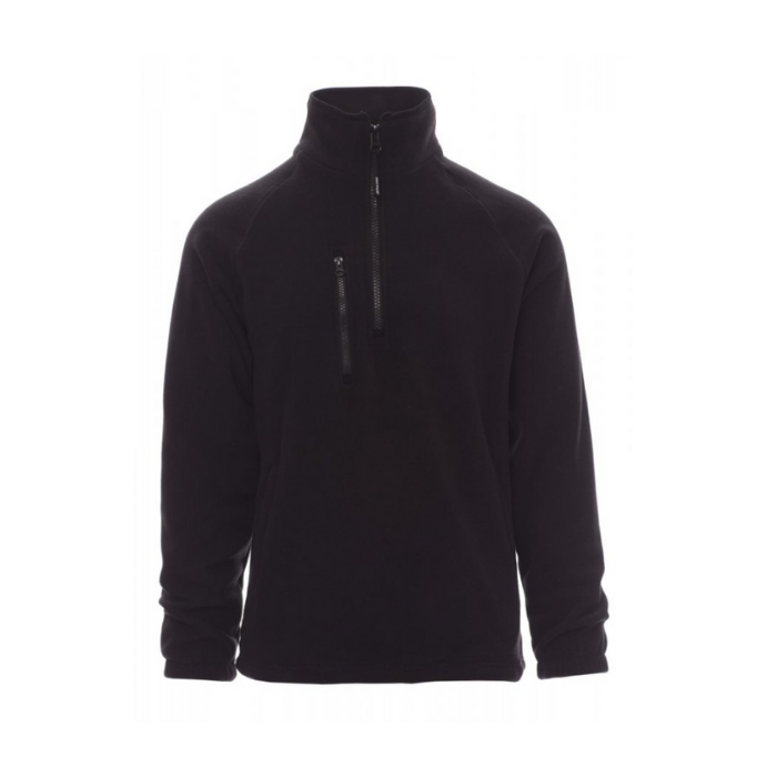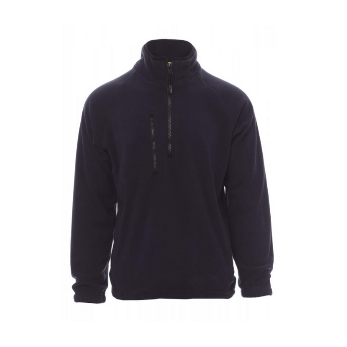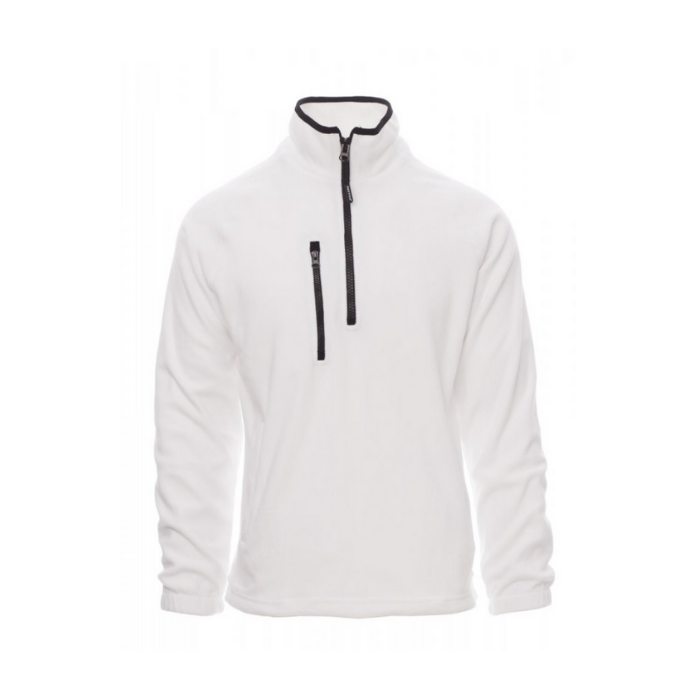 Descrizione: Pile, mezza zip 8mm in plastica nera, manica raglan, coulisse regolabile in vita, elastici stringi polso, due tasche con zip coperte, una tasca frontale con zip, collo con bordatura di rinforzo in contrasto, cuciture rinforzate.