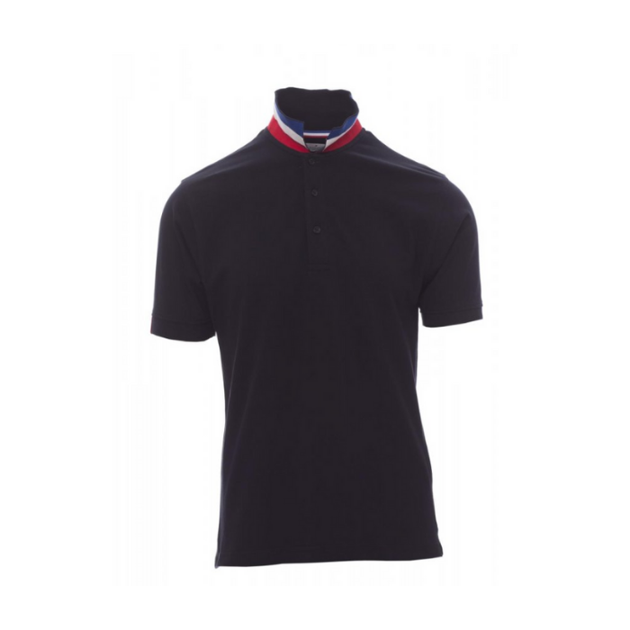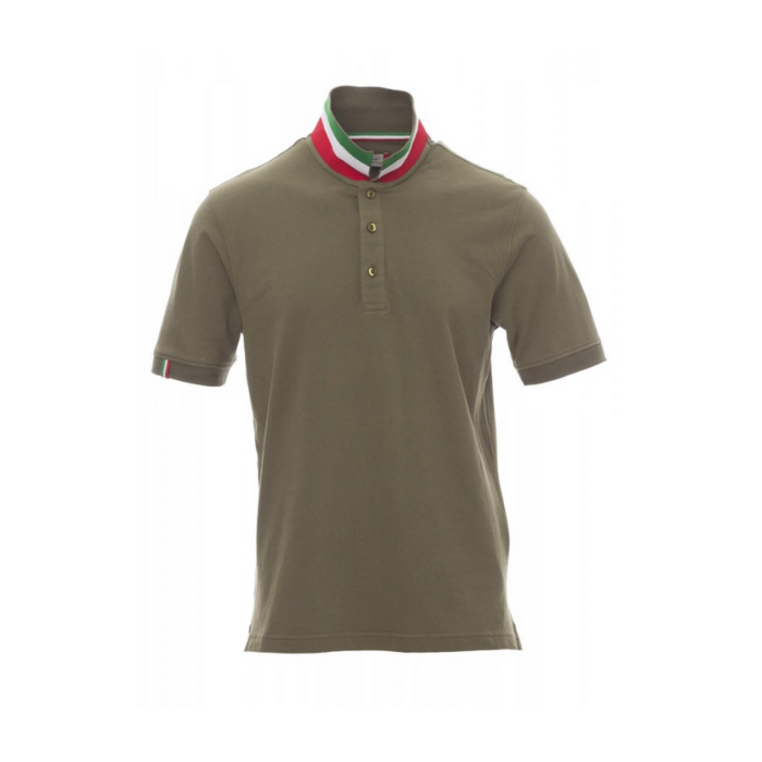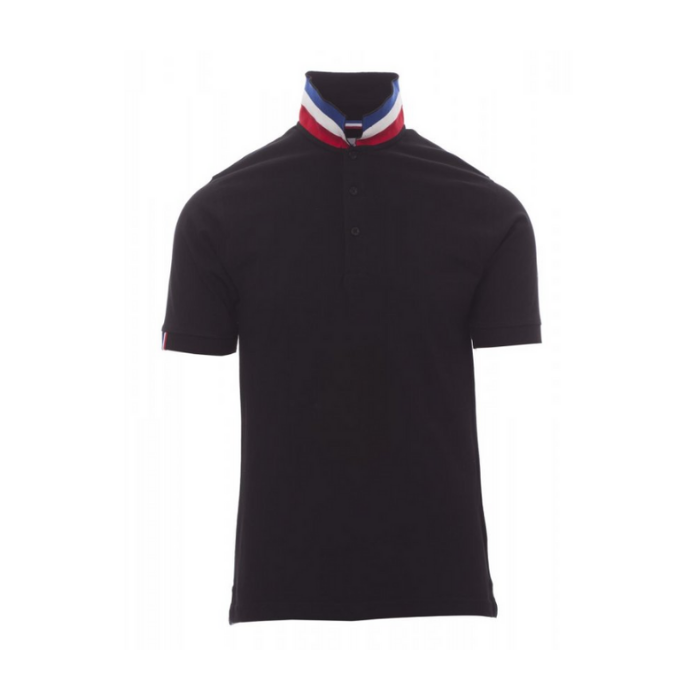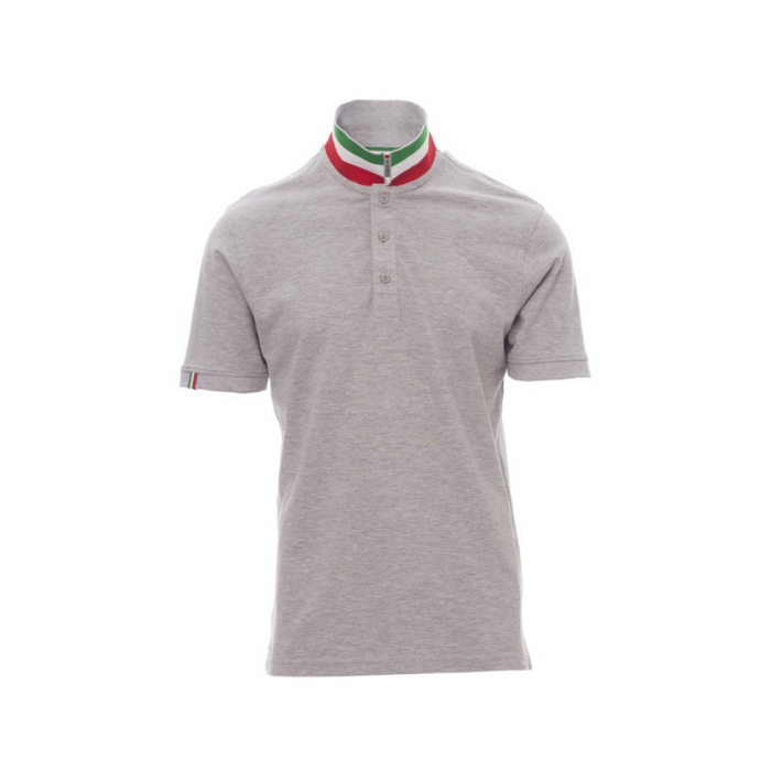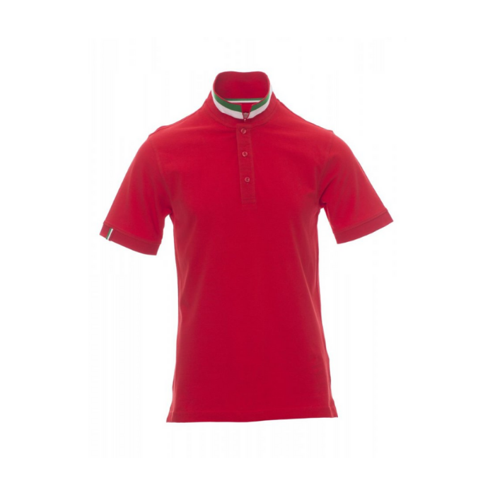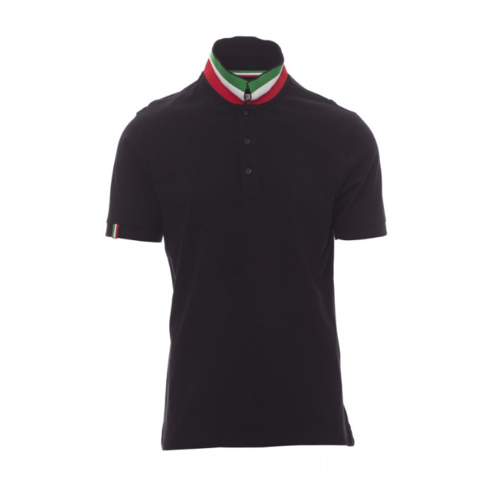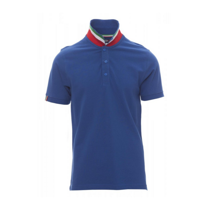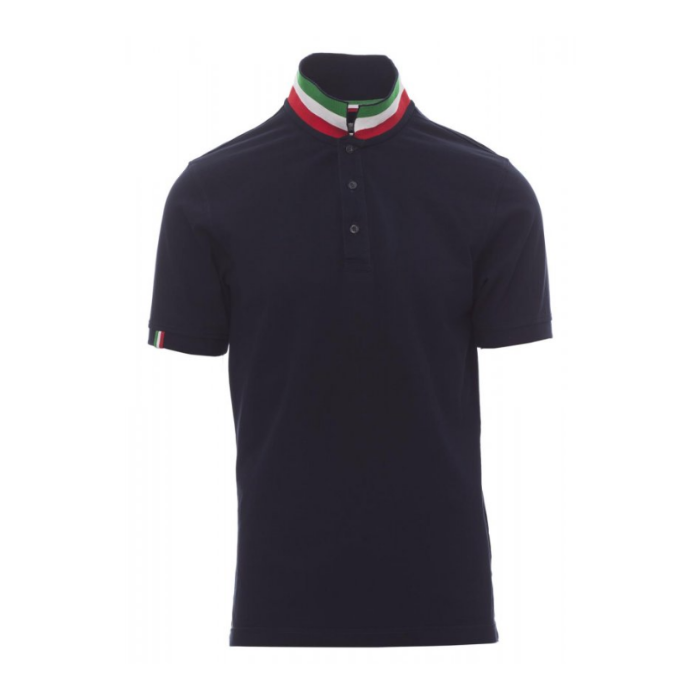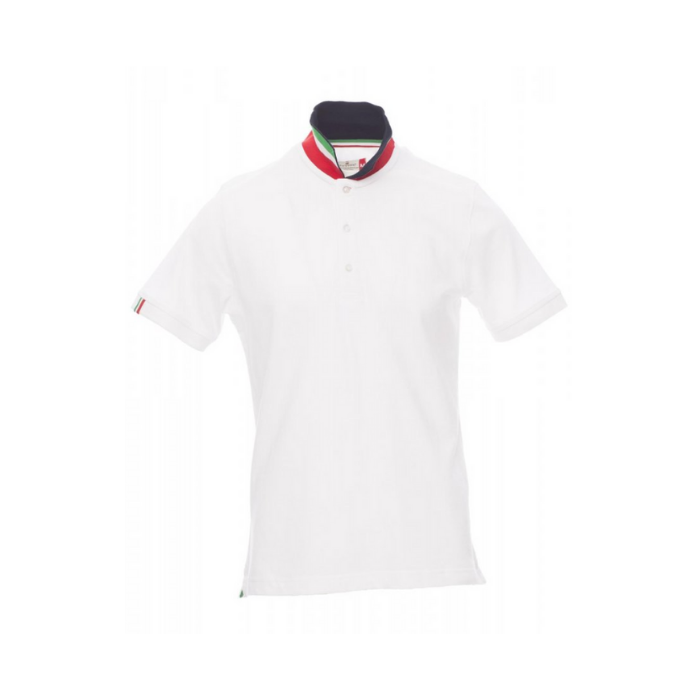 Descrizione: Polo da uomo a manica corta con tre bottoni in tinta ad effetto perlato, colletto da un lato in tinta, dall’altro lato a contrasto con colori bandiera visibile solo se alzato. Il bordo manica dx con fine inserto colore bandiera in contrasto, colletto e bordo manica a costine, spacchetti laterali con colore bandiera, cuciture del collo coperte con nastro in jersey colori bandiera, nastro di rinforzo laterale, rinforzo sagomato retrocollo.