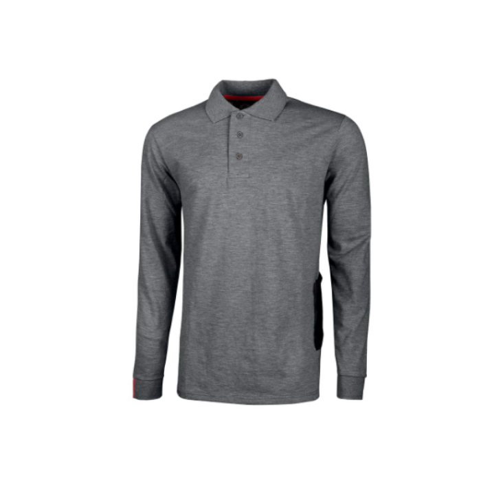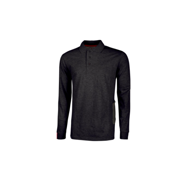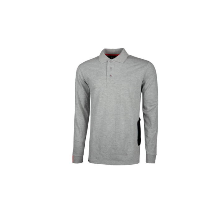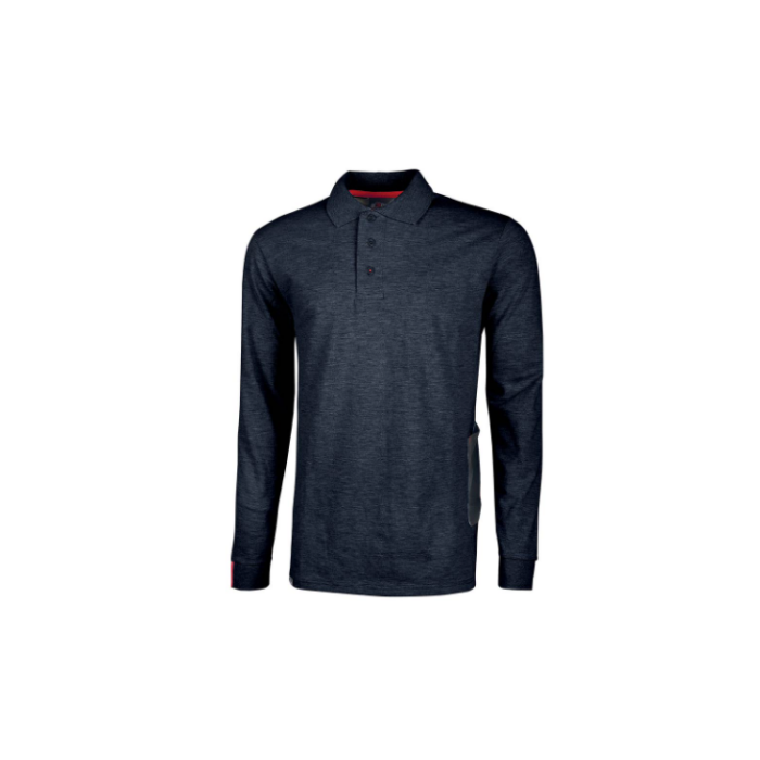 Descrizione: Polo Slim Fit, a manica lunga in piquet di polycotone. Il capo presenta: collo e bordo manica a costine elasticizzate, collo chiuso da tre bottoni in tono, fettuccia para-sudore bianca. Tasca porta cellulare/mascherina sul fianco sinistro con travetta rossa e nastro rosso/reflex su colletto nella parte posteriore sulla manica destra.