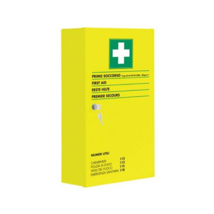 Descrizione: Armadietto in metallo verniciato con polvere epossidica FLUO, 2 ripiani, 3 vani, con serratura con chiave. Contenuto conforme al D.Lgs. n. 81/2008 – All. 1 D.M. 388/2003 Gruppi AB per aziende o unità produttive con tre o più lavoratori.