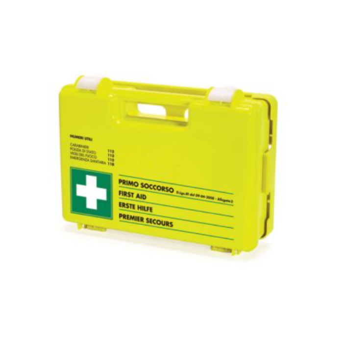 Descrizione: Valigetta Pharma[+]fluo realizzata in abs, facilmente individuabile all’interno delle attività lavorative grazie al colore giallo fluorescente e indispensabile all’esterno per le attività connesse all’edilizia e alla manutenzione stradale dove la mancanza di luce solare nelle ore pomeridiane o la presenza di nebbia e foschia potrebbero impedirne la facile individuazione.I principali numeri telefonici di emergenza serigrafati sul coperchio permettono al lavoratore di intervenire in caso di necessità in maniera tempestiva.