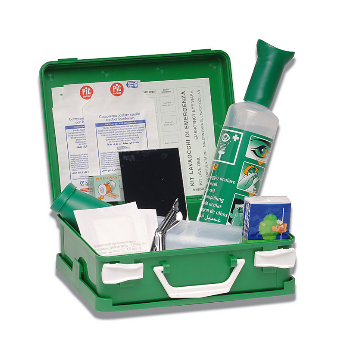 Consigliato per tutte le aziende e su automezzi di trasporto per effettuare un lavaggio oculare d’emergenza e la successiva medicazione.