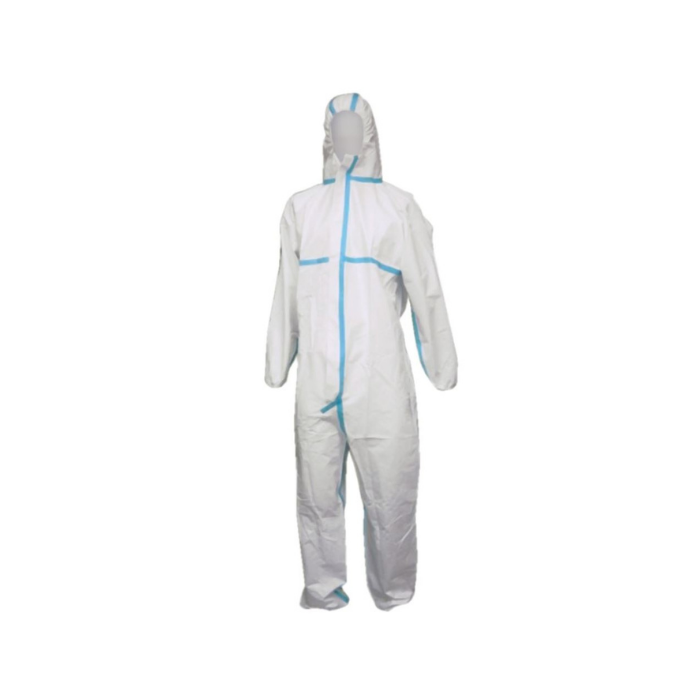 Descrizione: Tuta di protezione monouso in tessuto-non-tessuto bianco con laminazione esterna bianca. Cappuccio con estremità elasticizzata, elastici stringipolso, passanti elastici per pollici, stringicaviglia e stringivita. Chiusura a cerniera coperta da pattella adesiva, zip in plastica e tirante in metallo. Cuciture termosaldate con nastro azzurro a contrasto.