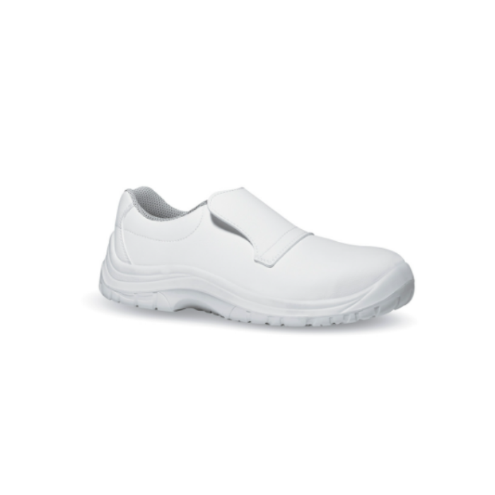 Scarpe antinfortunistiche bianche basse senza stringhe, sicure della linea Entry U Power, con tomaia in microfibra Lucky, puntale in acciaio, antiscivolo, suola PU/PU, S1 FO SR