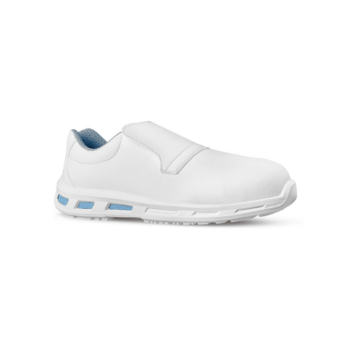 Scarpe antinfortunistiche totalmente “Metal free”, bianche senza stringhe, basse, leggere e comode u power della linea Red Lion, con tomaia New safety dry, idrorepellente, traspirante, puntale composite, antiscivolo e suola PU/PU infinergy, S2 FO SR.