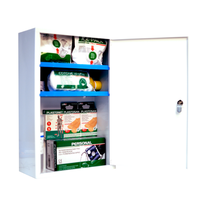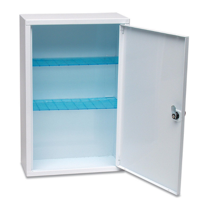 Descrizione: Armadietto pronto soccorso in metallo verniciato con polvere epossidica colore bianco, 3 vani, 2 ripiani interni, serratura con chiave.