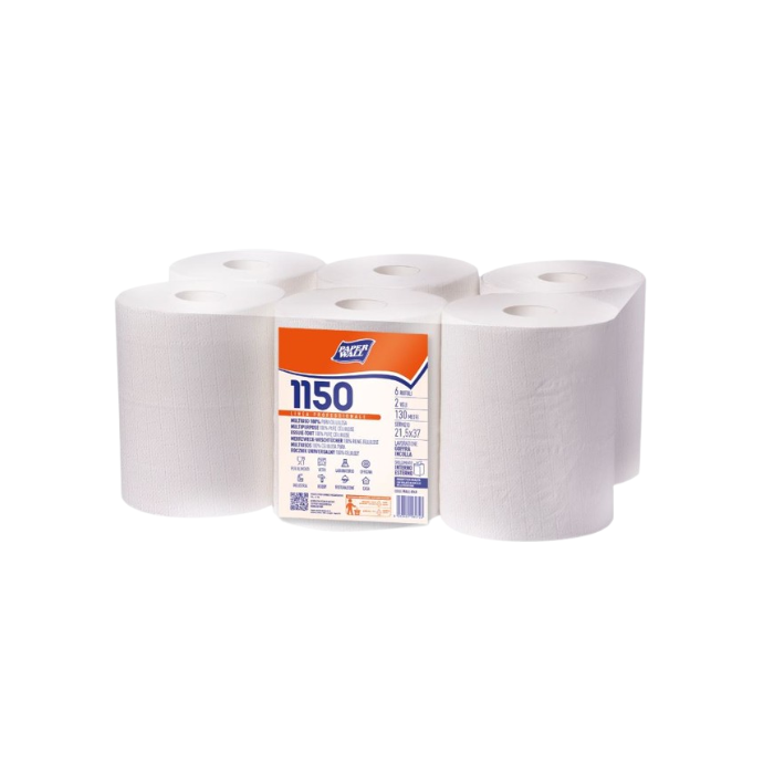 Descrizione: Rotoli di carta multiuso 2 veli in pura cellulosa, micro goffrata incollata lunghezza 130 mt, utilizzabile in tutti settori anche per uso alimentare, imballo da 6 pz, puoi filare la carta anche tirando dal centro del rotolo. prodotto di qualità controllato in ogni fase della lavorazione.