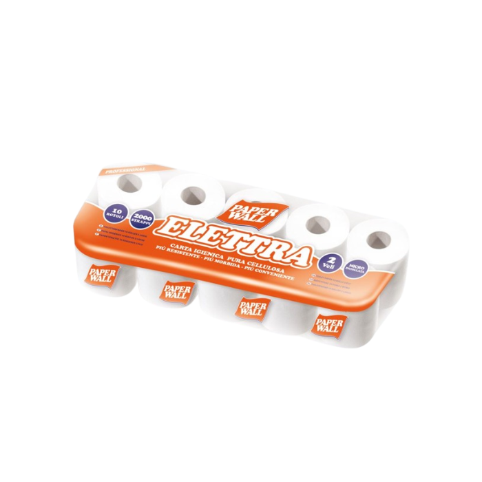 Descrizione: Rotoli di carta igienica 2 veli in pura cellulosa, goffrata incollata, lunghezza 2000 strappi ogni confezione da 10 rotoli . Imballo da 120 rotoli, 10 confezioni da 12 rotoli ogni confezione.