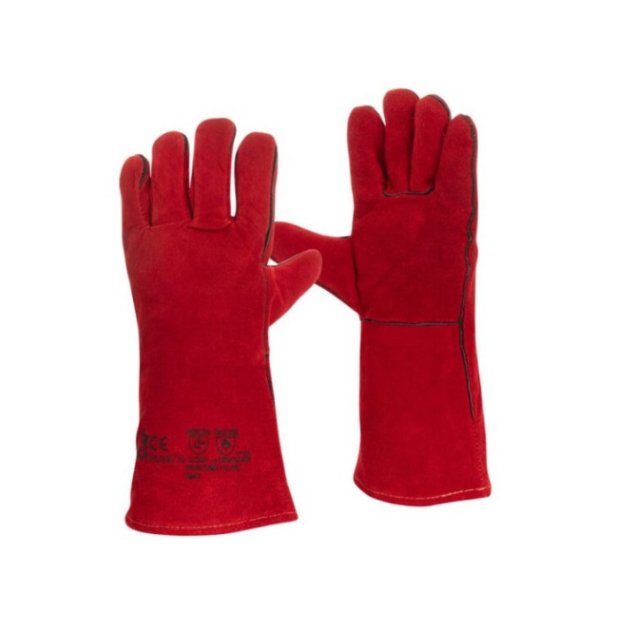 Descrizione: Guanto per saldatore in pelle crosta con cuciture in fibra para-aramidica, fodera in cotone, polsino rinforzato, cuciture rinforzate con piping nero, pollice alato, colore rosso.