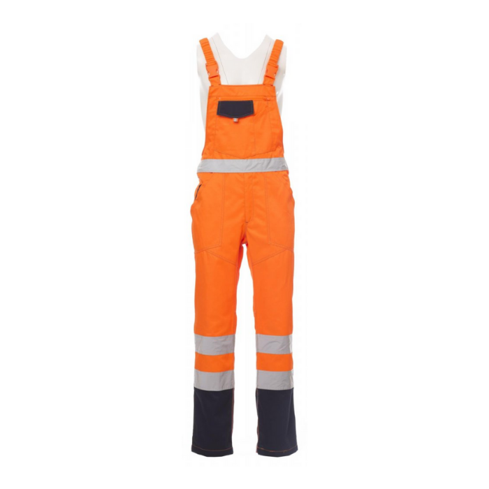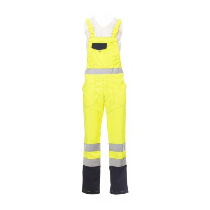 Descrizione: Pettorina alta visibilità con bande riflettenti ed ampia protezione renale, bretelle elasticizzate e fibbie con chiusura automatica, apertura laterale con bottoni e elastico in vita sul retro. Triple cuciture di rinforzo nel cavallo e interno gamba. Doppia tasca al petto di cui una con zip e anello di aggancio per porta badge, una con patta e un porta penne. Due ampie tasche anteriori di cui una con taschino portamonete, una tasca posteriore chiusa con patta e porta metro laterale destro.