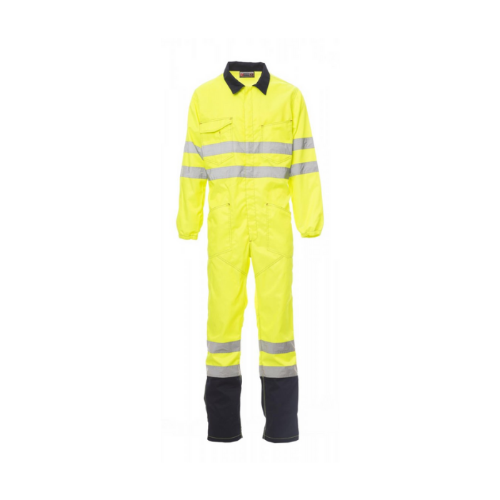 Descrizione: Tuta alta visibilità con: bande riflettenti, cerniera centrale coperta a doppio cursore, elastico in vita sul retro, triple cuciture di rinforzo nel cavallo ed interno gamba. Due ampie tasche applicate, due tasche al petto di cui una chiusa con patta e anello di aggancio per porta badge, un portapenne, una tasca posteriore con patta, porta metro laterale destro. Polsini con elastici.