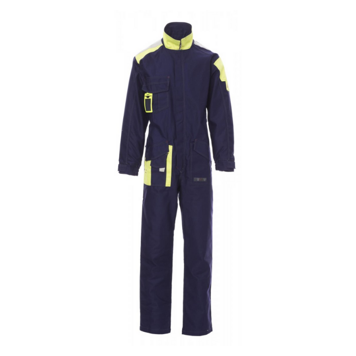 Descrizione: Tuta Multipro con: chiusura frontale con zip in metallo e patta di copertura, polsini con elastico e regolazione con fettuccia e bottone, tre tasche anteriori multifunzione con patta e velcro, porta badge staccabile e richiudibile, due tasche posteriori con patta e velcro. Inserti ed impuntare a contrasto, cuciture doppie con filo a contrasto, bande riflettenti alle spalle e schiena e su una tasca posteriore, taglio ergonomico elastico in vita interno schiena.